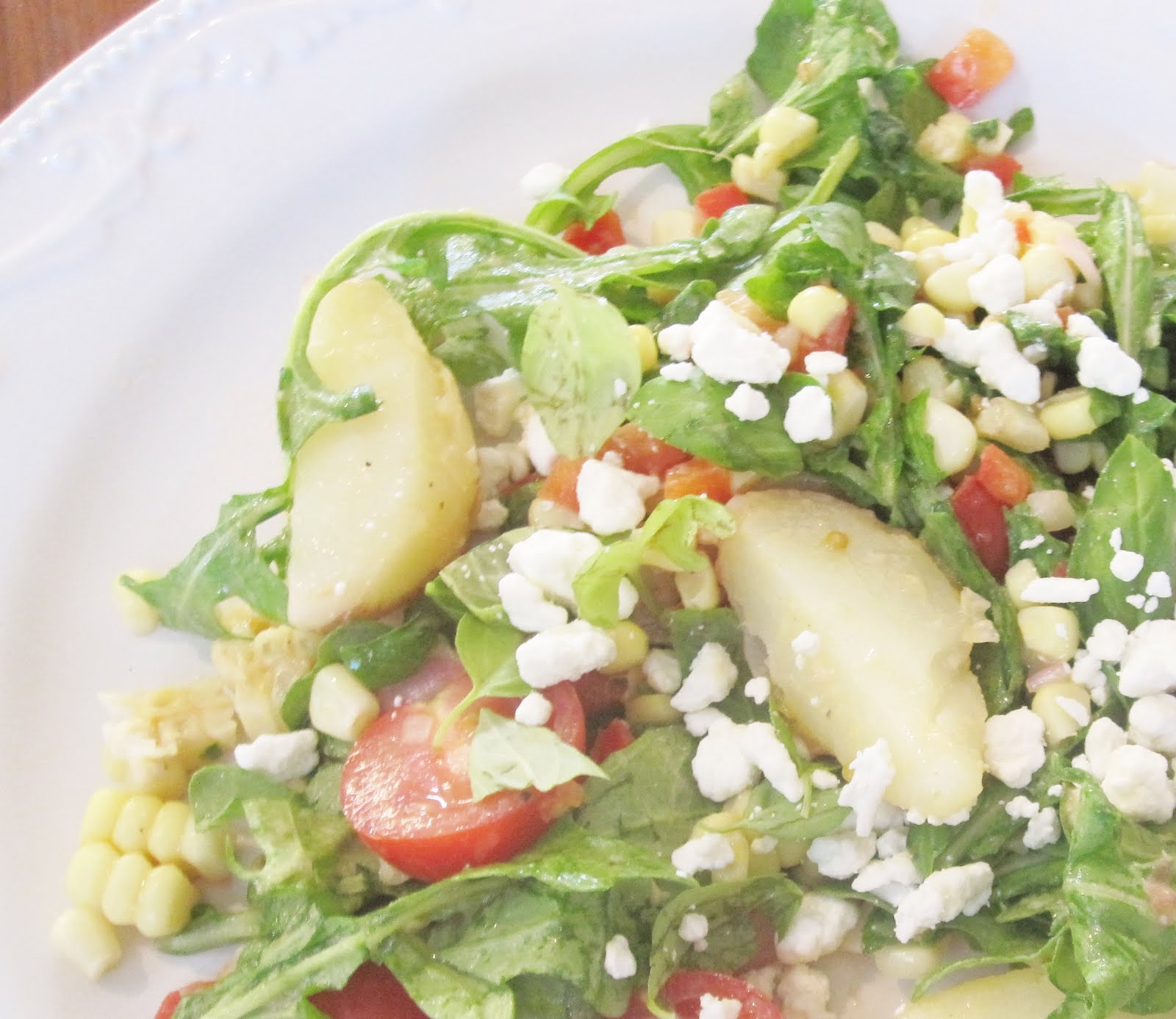 1. Place potatoes in a small saucepan; cover with water. Bring to a boil; cook 11 minutes or until tender. Drain and chill. Cut potatoes in half lengthwise. Combine potatoes, corn, tomatoes, and bell pepper in a large bowl.