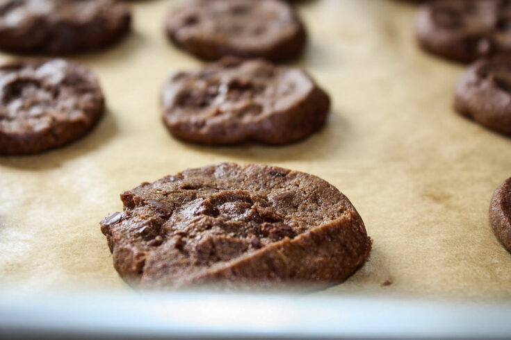 The cookies are made with a combination of all-purpose flour, cocoa powder, and baking soda. They also include butter, granulated sugar, brown sugar, salt, vanilla extract, and chunks of dark chocolate. The dough is mixed until the ingredients come together, and then it’s shaped into logs, chilled, sliced, and baked until slightly firm on the outside while remaining soft and fudgy on the inside.