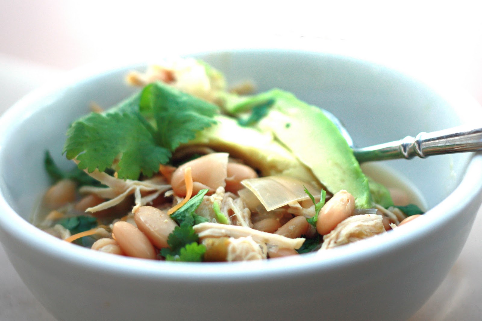 Place all ingredients except chicken and cilantro into slow cooker and stir. Add chicken and make sure it’s covered with the liquid/bean mixture. Add more broth if necessary. Cook on low for 4-6 hours. Using 2 forks, shred chicken and stir. Just before serving stir in cilantro. Serve with shredded Mexican or cheddar cheese, avocado, tortilla chips.