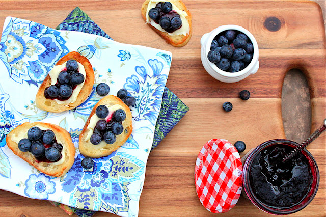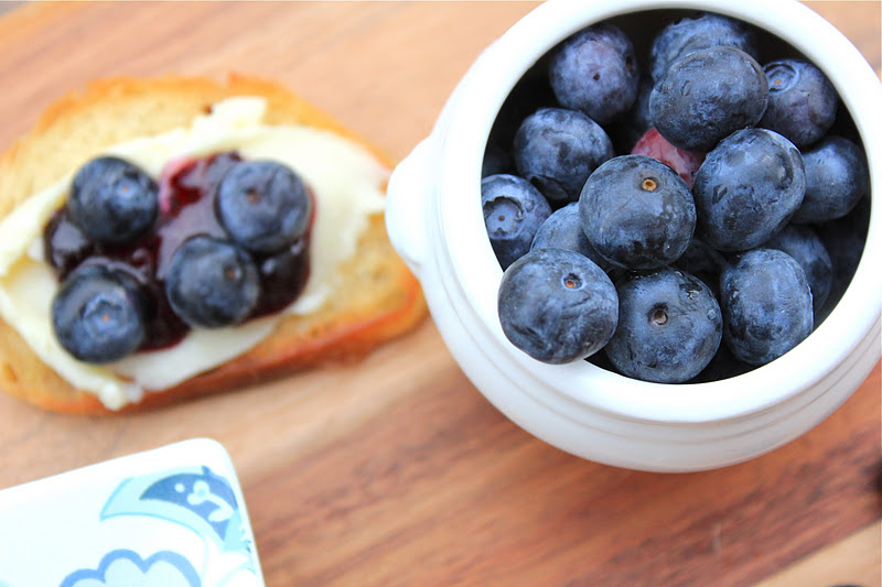 Heat frying pan on stove-top. Melt butter and place bread sliced in the pan and cook on each side until lightly browned. Take out of pan and cool. Top with white chocolate cream cheese, jam and blueberries. Serve.