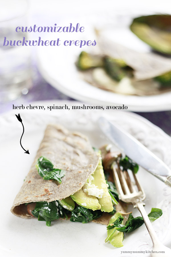 The fun thing about crepes is that they’re completely customizable – you can fill them however you please. I used my favorite ingredients: spinach, avocado, mushrooms, and a spread of herby goat cheese. My yummy little one had hers filled with leftover roasted broccoli and cheddar cheese.