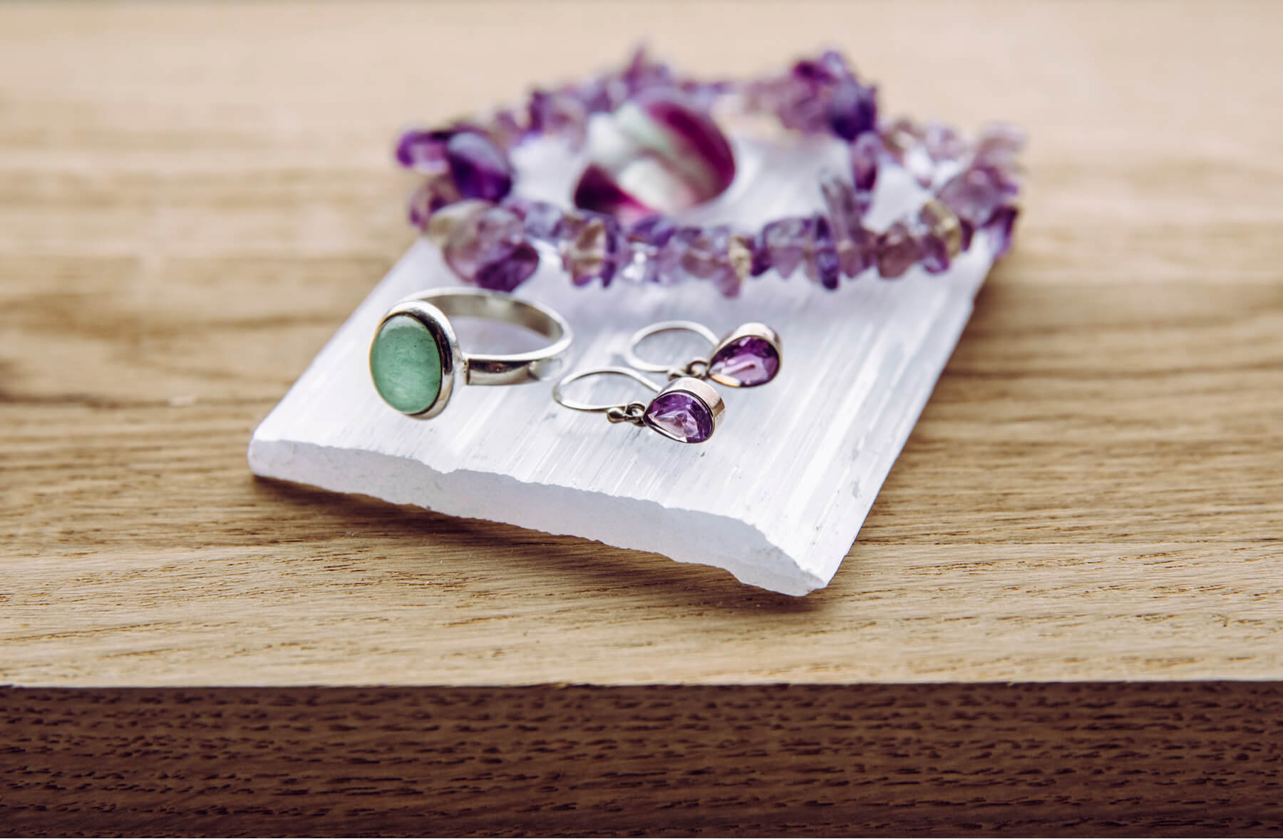A slab of white Selenite sits on a wooden table. Crystal jewelry sits atop the selentie for cleansing and charging.