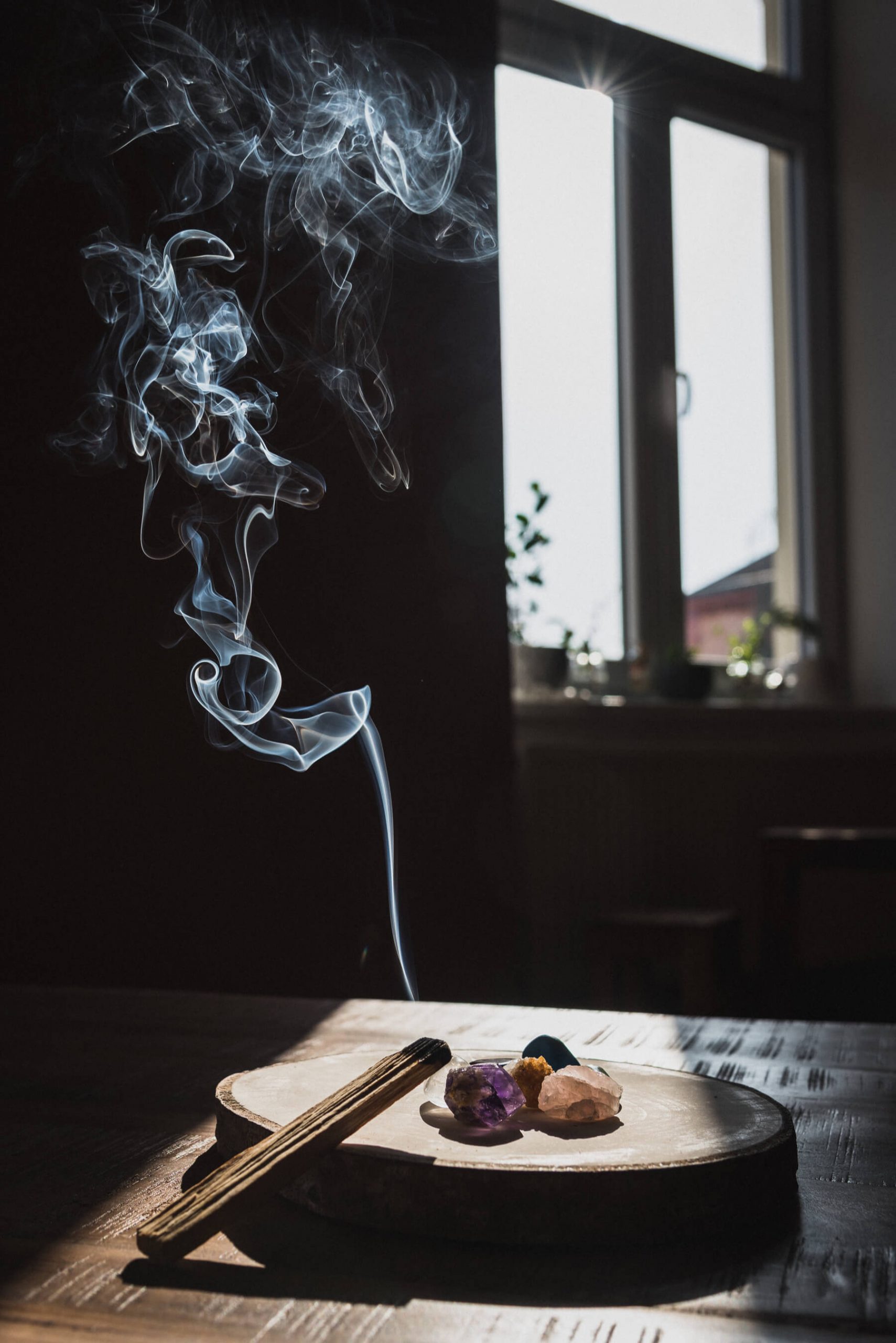 Smoke from palo santo drifts up near a pile of crystals on a table.