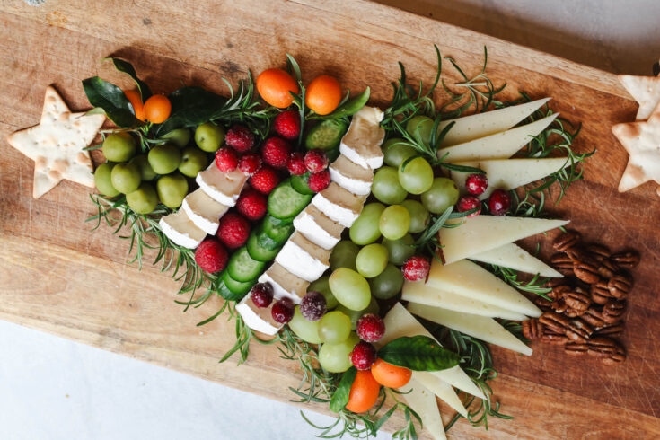 This version features creamy Brie, Manchego, grapes, and cucumbers, along with bright pops of color from raspberries and sugared cranberries. Fresh rosemary sprigs act like “evergreen branches,” and a simple cracker cut into a star makes the perfect tree topper.