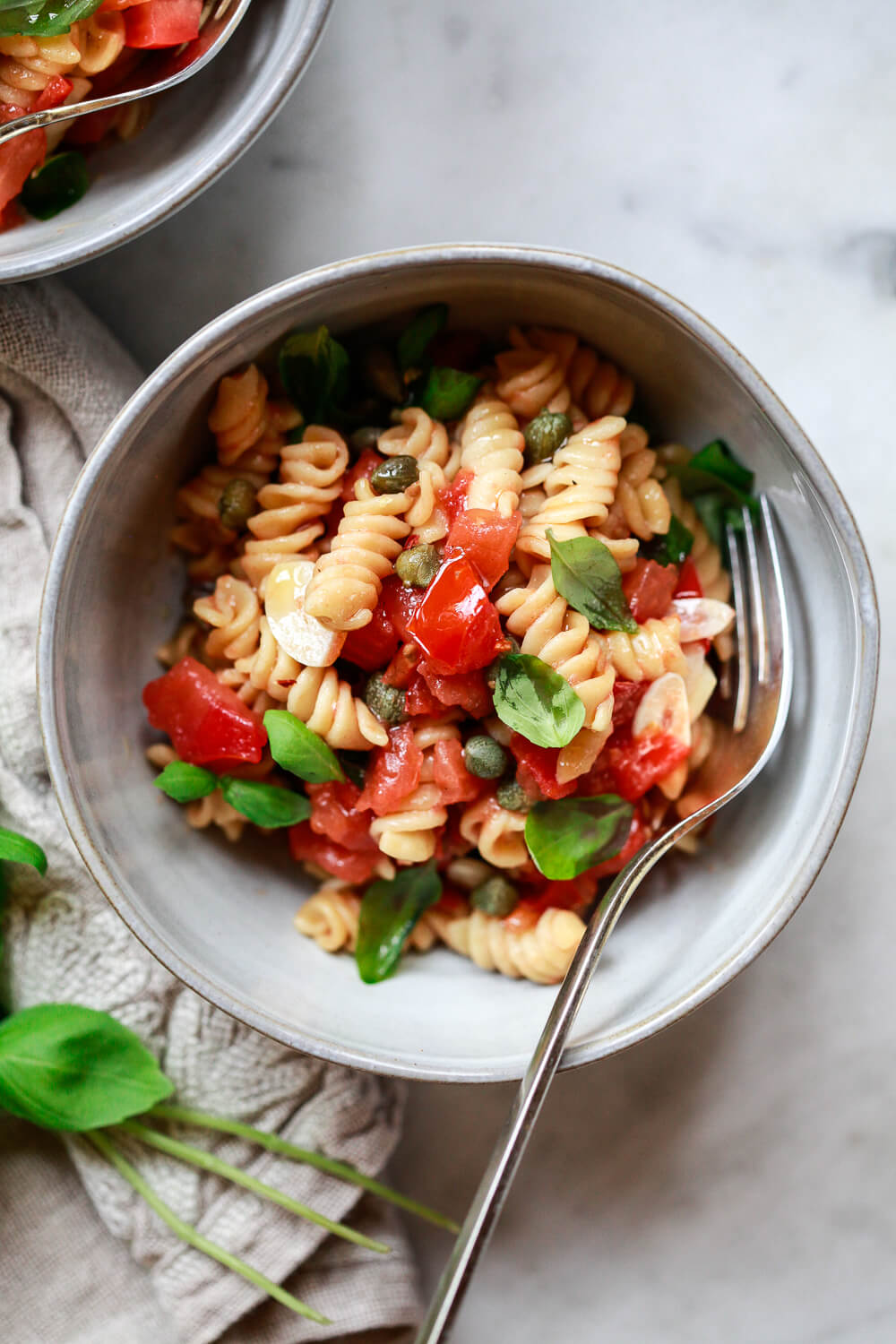 This fresh and easy pasta recipe is loaded with garlic, fresh tomatoes, basil, and capers.