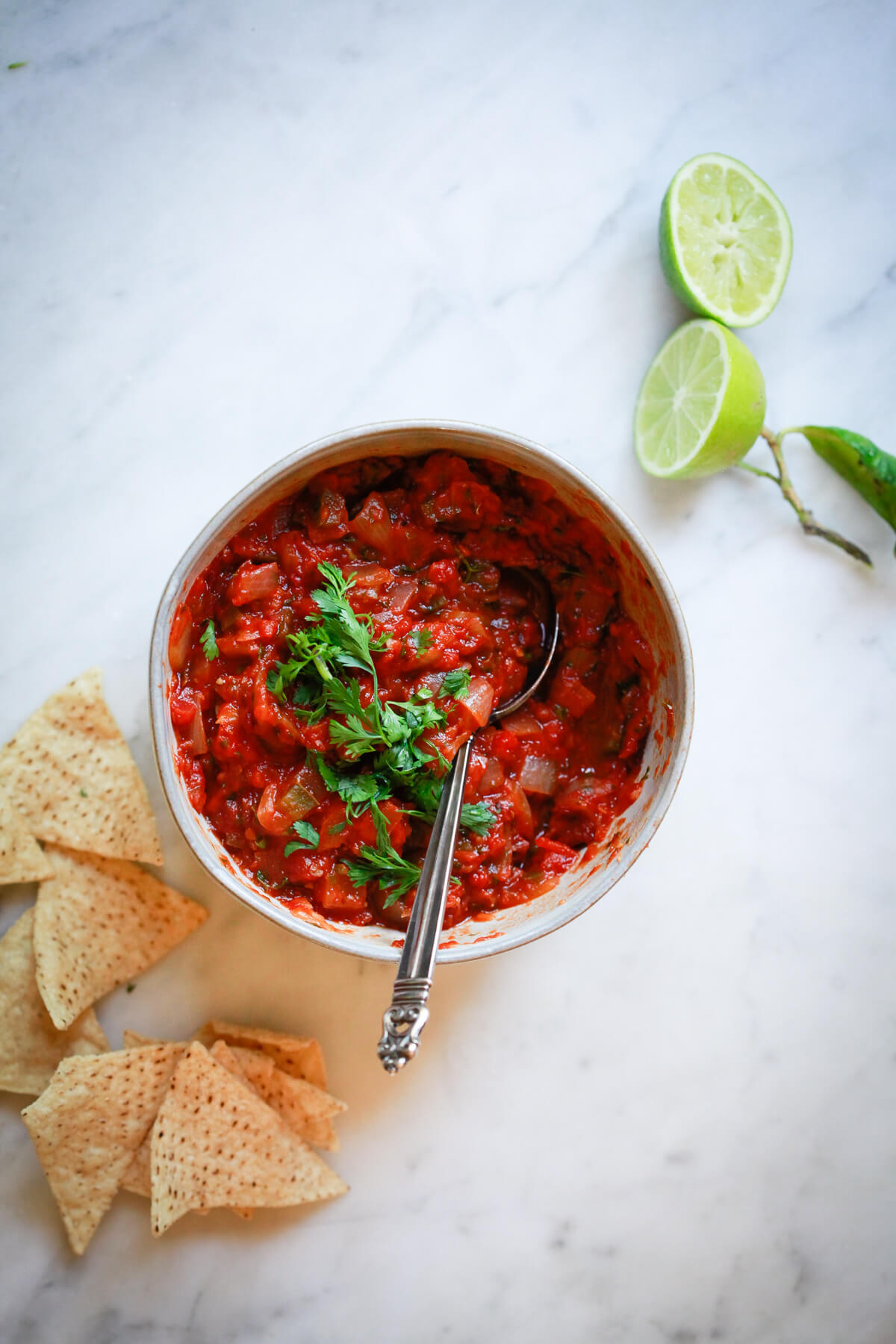 Place the tomatoes in a blender and pulse a few times to puree. Keep the sauce to add back into the pot if the salsa gets too dry, or save for another use.