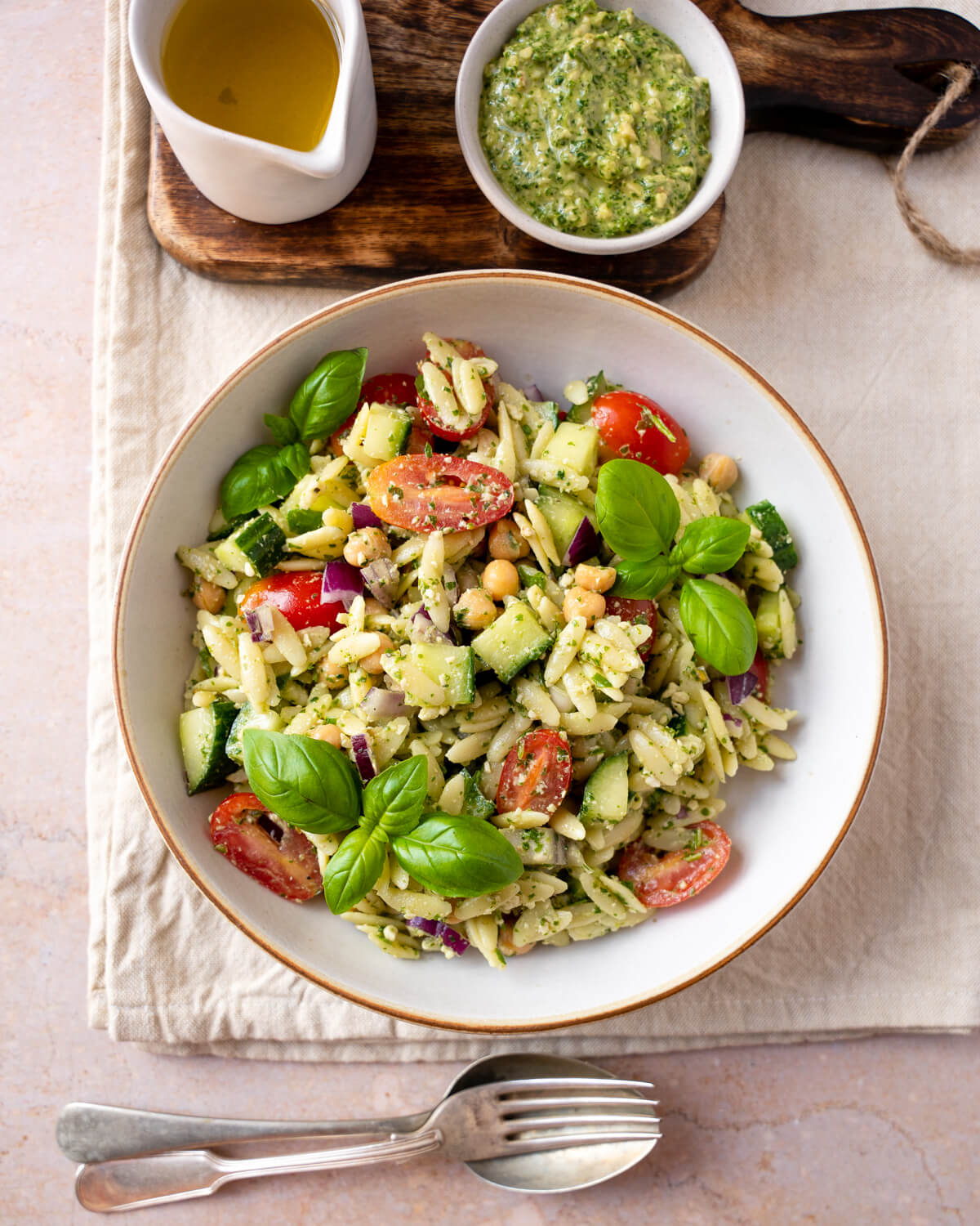 Looking for orzo recipes? This easy orzo salad is made with orzo pasta, chickpeas, tomatoes, cucumber, basil, and pesto.