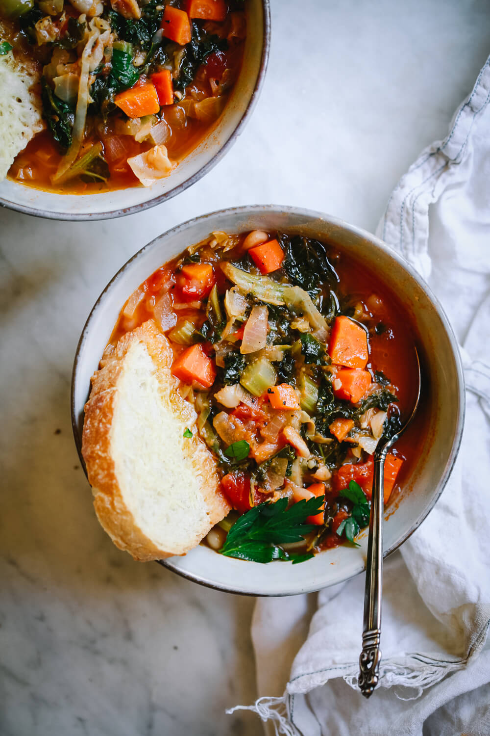 Warm up with a bowl of ribollita Toscana, a classic Tuscan vegetable soup with bread.